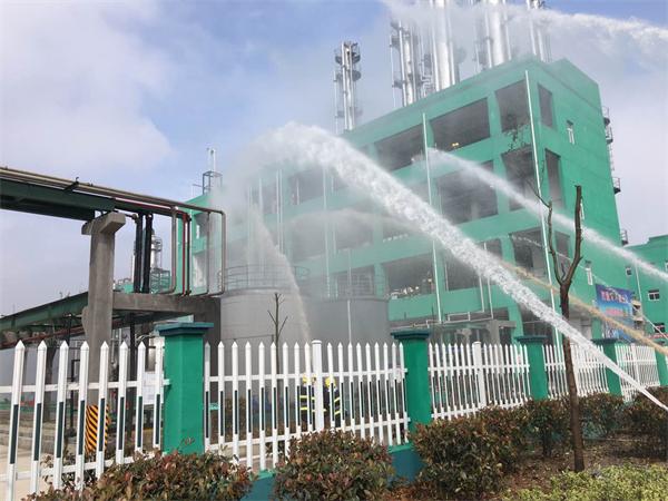 本次消防演練模擬閏土染料公司噴塔尾氣處理裝置起火這一突發狀況,通過突發情況報警、人員疏散、滅火救援三個環節,啟動火災撲救應急預案。閏土染料公司安全員在巡查車間時,發現噴塔尾氣處理裝置起火,隨即向公司安環科長匯報火災情況,并通知報備股份公司HES部門和園區保衛部。公司領導接到火情電話后立即通知車間工作人員撤離,并聯系各志愿消防隊隊長,根據規定方案實施消防救援。各志愿消防支隊模擬真實火災事故,有效地配合、協調、支援,并以最短時間滅火成功,成功疏散全體員工。