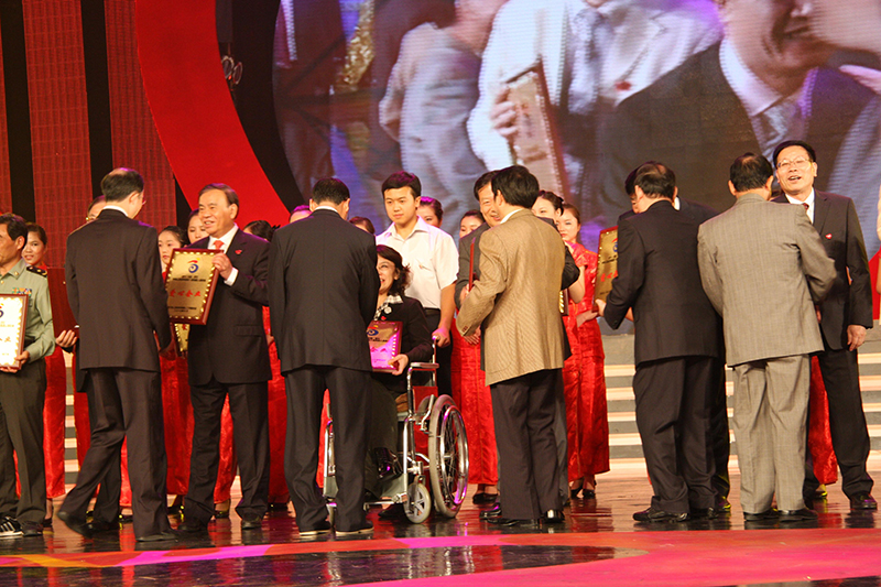10月11日,阮加春總經(jīng)理在第八屆全國(guó)殘運(yùn)會(huì)倒計(jì)時(shí)一周年大型愛(ài)心助殘晚會(huì)上接受中國(guó)殘聯(lián)主席張海迪(坐輪椅者)頒發(fā)“愛(ài)心企業(yè)”獎(jiǎng)牌。浙江省省長(zhǎng)呂祖善等領(lǐng)導(dǎo)出席了本次活動(dòng)。